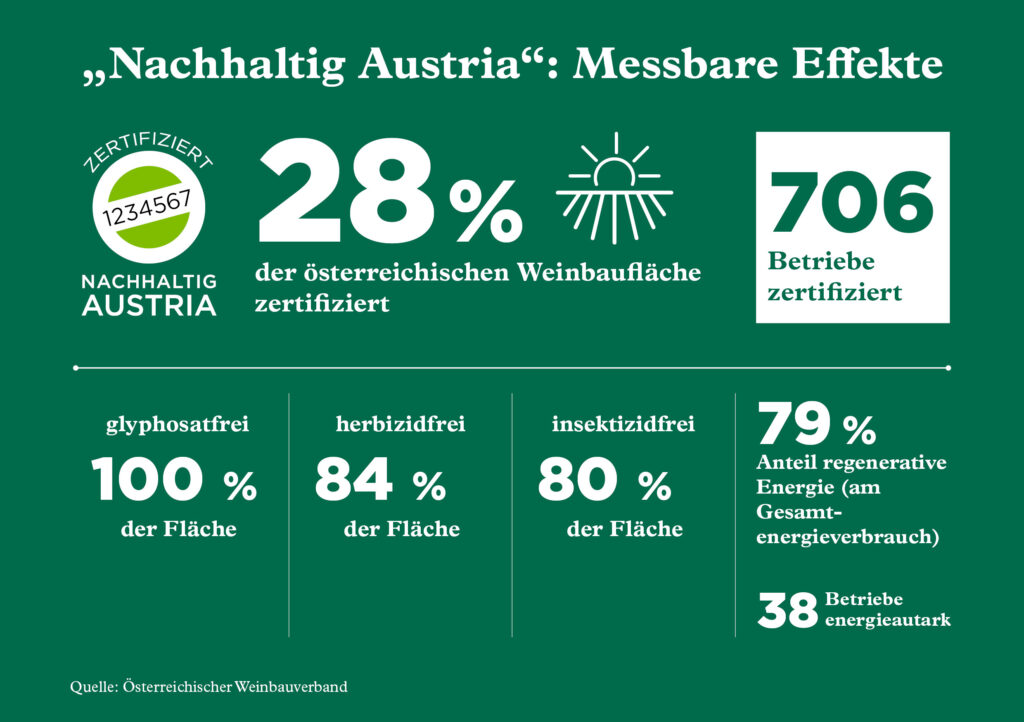 Chris Yorke, Geschäftsführer der ÖWM, erklärt es ganz pragmatisch aus wirtschaftlicher Sicht: „Nachhaltig Austria ist ein international anerkanntes Gütesiegel im Weinbau. Es steht für klar messbare, nachhaltige Praktiken in allen Wirtschaftsbereichen eines Weinguts. Das hat auch ganz konkrete wirtschaftliche Vorteile, denn in einigen unserer wichtigsten Exportmärkte, wie Skandinavien oder Kanada, spielen glaubwürdige Umweltzertifizierungen eine immer wichtigere Rolle bei Kaufentscheidungen.“